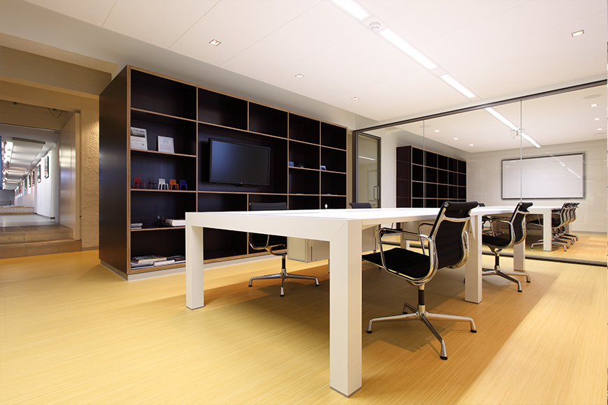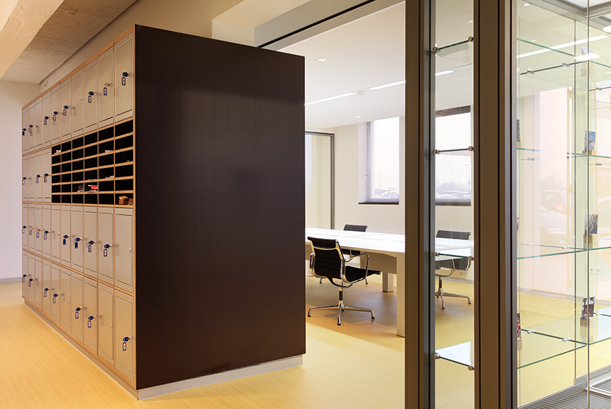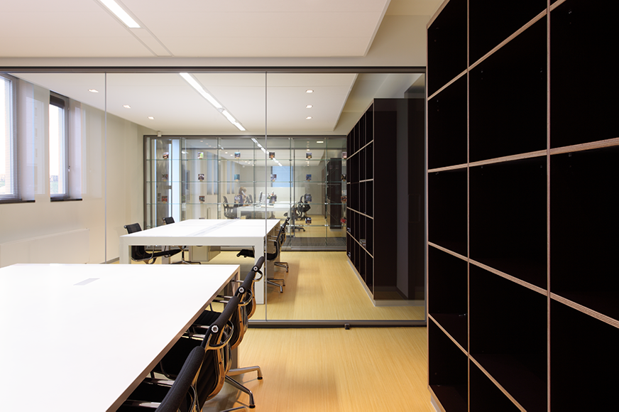 De zone van het entreegebied staat ook in verbinding met de werkvloer in de grote hal van het gebouw. Een langgerekte kastenwand biedt verschillende doorgangen en doorkijkjes en tegelijkertijd verhult deze een betonnen constructie. Medewerkers van het bureau hebben met behulp van hun vingerafdruk toegang en gasten kunnen eerst aan de receptie worden ontvangen. Tot slot geeft de vloerafwerking van Artoleum een warme en natuurlijke uitstraling aan de nieuwe entree van het Rotterdamse architectenbureau.